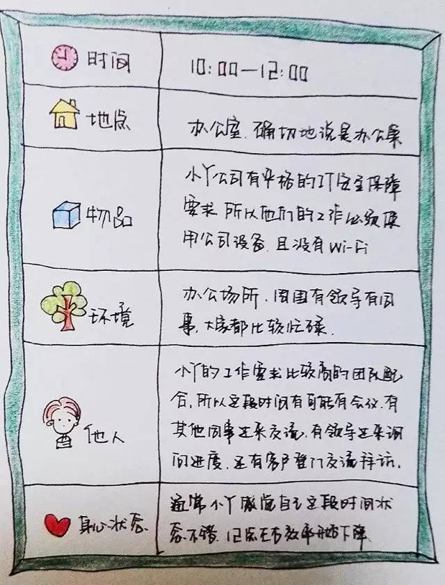 首先将自己的时间划分成不同的时间段,以上图为例,是纪元老师书中一位职场某员工10点到12点着两个小时的时间段,按照六要素的分发,该员工从时间、地点、物品、环境、他人(干扰性)、身心状态六个方面对自己该时间段有了基本的认识和了解。