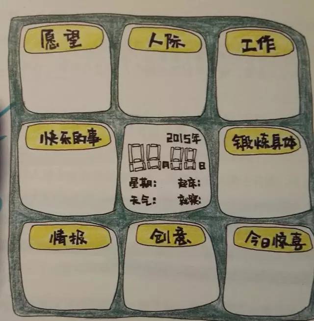 将每一天,分为八个版块,中间写上日期,天气,也可以标注出当天的心情。比如说我将其他的八项分为写作、阅读、学习、挑战杯、练字、锻炼身体、小确幸、愿望。大家可以根据自己的目标和计划作出相应的调整即可。