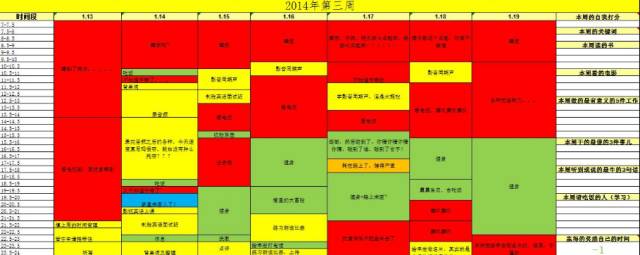 当然,你不必每半个小时就记录一下时间,只需要每晚睡前花5-10分钟记录即可。如果想不起来做了什么就果断的标记为浪费的时间。因为如果你真的做了有意义的事情,你肯定不会忘记。能让你忘记的事情基本都是一些无意义的事情,比如刷微博,看网页,这类时间就果断标记成红色。