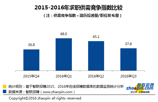截至9月底,2016年秋季求职期全国人才供需竞争指数(供需竞争指数=收到的简历投递量/发布的职位数量)为37.8,全国平均38人竞争一个岗位。