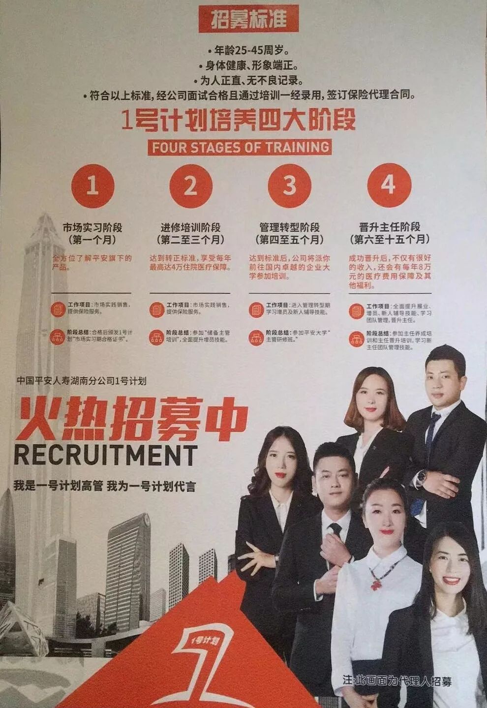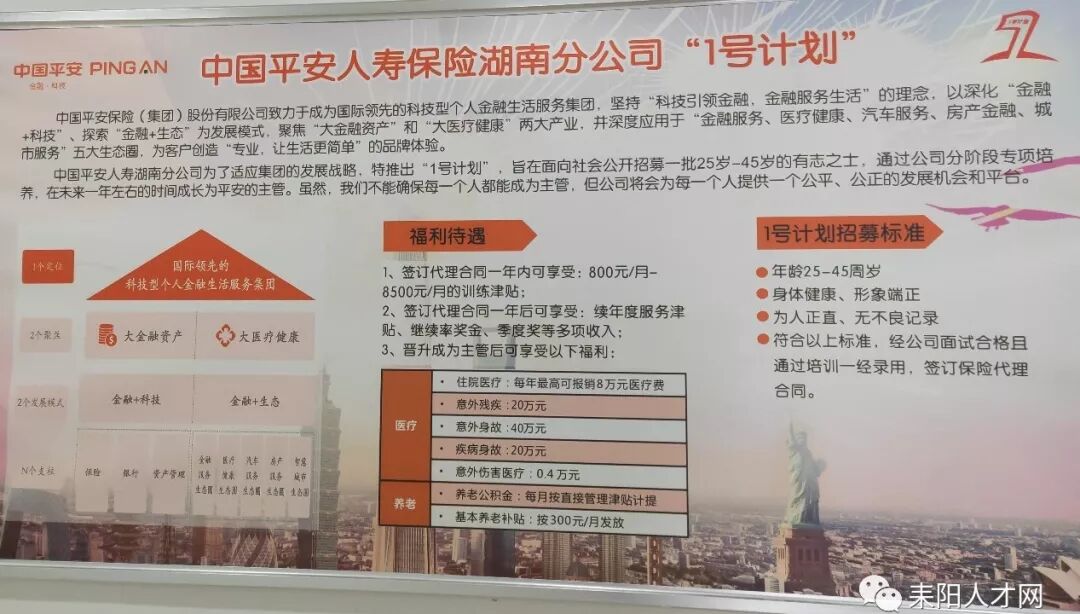 "1号计划“是湖南分公司面向社会公开招募20岁—50岁的有志之士。通过公司分阶段专项培养’在未来一年左右的时间成长为平安主管。