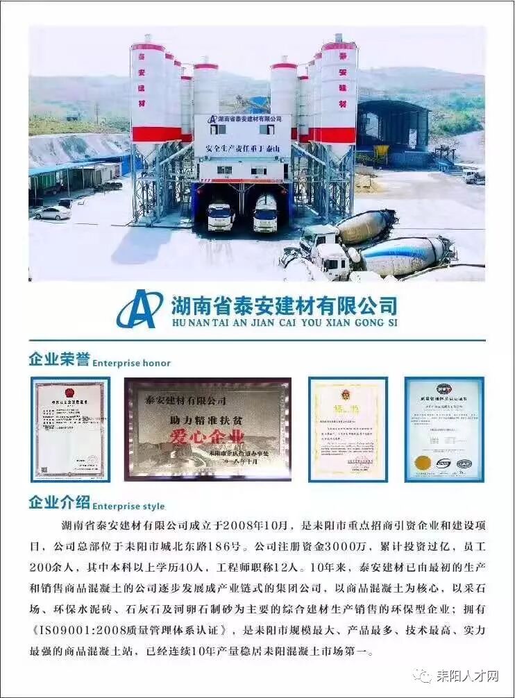 湖南省泰安建材有限公司(原耒阳市泰安混凝土有限公司)是耒阳市建工局2008年招商引资重点企业,由佳泰国际(香港)投资有限公司投资建设。公司总部位于耒阳市城北东路186号。泰安集团旗下拥有混凝土搅拌站两个生产基地(分别在水东江双洲村、余庆同仁村)、泰安采石场、泰安环保砖厂、泰安砂场。企业总投资超过上亿元,现有员工近200人,其中本科以上学历40人,工程师职称12人,是一家充满活力,蓬勃向上,极具市场潜质的兴盛现代企业。